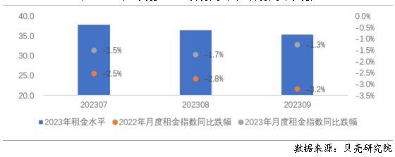 圖6 2023年三季度重點(diǎn)40城月度租金水平及月度租金指數(shù)變化