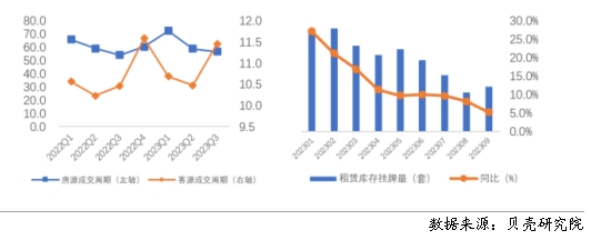 根據(jù)貝殼研究院數(shù)據(jù),全國(guó)重點(diǎn)40城三季度房客源成交周期分別為56.7、11.5天,房源成交周期環(huán)比減少2.1天,同比增加2.7天;客源成交周期環(huán)比延長(zhǎng)1天,同比延長(zhǎng)1天。隨著個(gè)人租賃房源供應(yīng)的增加,疊加保障性租賃住房、市場(chǎng)化集中式租賃房源的增加,個(gè)人業(yè)主出租房源出租速度減緩。從庫(kù)存房源來(lái)看,今年1-9月租賃庫(kù)存房源量均呈現(xiàn)同比增加的趨勢(shì),與此同時(shí),租客租房面臨的選擇項(xiàng)增多,租客對(duì)于租賃房源可選類型和房源量均有增加。