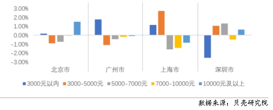 貝殼研究院數(shù)據(jù)顯示,一線城市呈現(xiàn)不同程度的重心下移,同時(shí)北京、深圳還呈現(xiàn)出延遲購(gòu)房“購(gòu)轉(zhuǎn)租”的特征,高套均支出區(qū)間的租賃房源成交增加。上海和廣州租賃重心下移態(tài)勢(shì)明顯。上海套均租金5000元以內(nèi)的成交占比增加了將近4個(gè)百分點(diǎn),5000元以上的占比均呈現(xiàn)減少趨勢(shì),尤其是套均租金在5000-10000元區(qū)間的房源占比;廣州套均租金在3000元以內(nèi)的增加了1.8個(gè)百分點(diǎn),3000元以上的均呈現(xiàn)減少趨勢(shì)。