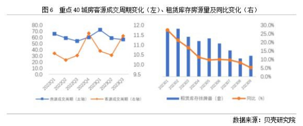 依據(jù)貝殼研究院數(shù)據(jù)監(jiān)測,全國重點40城2023年三季度房客源成交周期分別為56.7、11.5天,房源成交周期環(huán)比減少2.1天,同比增加2.7天;客源成交周期環(huán)比延長1天,同比延長1天。隨著個人租賃房源供應(yīng)的增加,疊加保障性租賃住房、市場化集中式租賃房源的增加,個人業(yè)主出租房源出租速度減緩。從庫存房源來看,2023年1-9月租賃庫存房源量均呈現(xiàn)同比增加的趨勢,與此同時,租客租房面臨的選擇項增多,租客對于租賃房源可選類型和房源量均有增加。