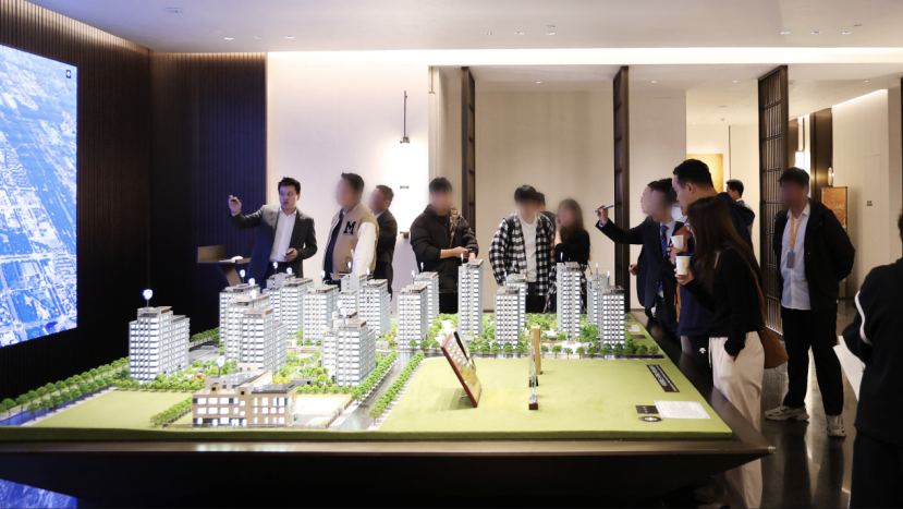 (北京房山區(qū)華潤(rùn)京熙潤(rùn)府售樓處沙盤(pán)前看房人群絡(luò)繹不絕)