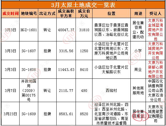 3月份,太原共5宗用地成交,除南沙河南岸一宗商住用地被太原龍城南部置業(yè)有限公司摘得以及一宗國(guó)有土地使用權(quán)轉(zhuǎn)讓以外,其余3宗均被萬(wàn)科摘得,成為本月土地市場(chǎng)的最大看點(diǎn)。