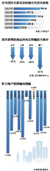 北京在9月30日出臺的政策影響了市場熱度,市場進入了急速冷凍階段。中原地產(chǎn)研究中心統(tǒng)計數(shù)據(jù)顯示,2016年國慶長假期間,7天北京新建住宅簽約216套,二手房住宅簽約209套。合計簽約425套。而2015年國慶7天簽約為543套。從簽約數(shù)據(jù)看,北京新建住宅成交量為2011年來6年最低點。對此,中原地產(chǎn)首席分析師張大偉分析認為,預(yù)計北京房價將快速降溫,四季度漲幅將明顯放緩,在自住房大量供應(yīng)后,部分區(qū)域的價格很可能出現(xiàn)調(diào)整。