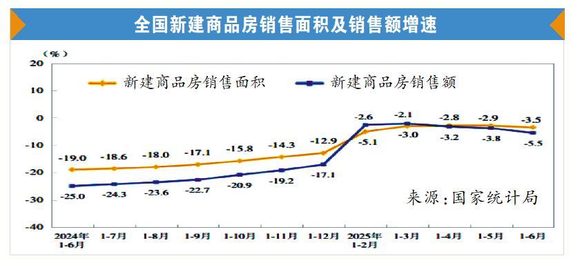 根據(jù)國家統(tǒng)計(jì)局發(fā)布的2025年上半年全國房地產(chǎn)市場(chǎng)基本情況,上半年,新建商品房銷售面積45851萬平方米,同比下降3.5%;其中住宅銷售面積下降3.7%。新建商品房銷售額44241億元,下降5.5%;其中住宅銷售額下降5.2%。6月末,商品房待售面積76948萬平方米,比5月末減少479萬平方米。其中,住宅待售面積減少443萬平方米。