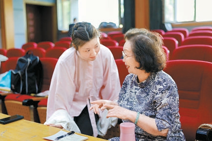 京劇表演藝術(shù)家閻桂祥(右)為陳張霞親授《白蛇傳》。蘇巖攝