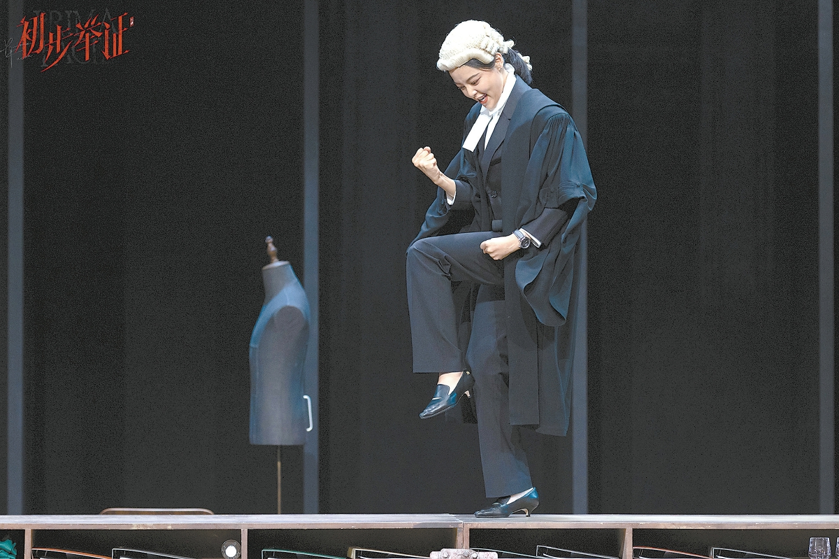 舞臺極為對稱。最醒目的,是兩側(cè)微微斜切向后景的賽馬欄。如果從上方俯視,賽馬欄將舞臺空間變成了一個等邊梯形,中央橫放著長長的組合式開架矮桌柜。這是由蘇西·米勒編劇、周可導(dǎo)演的獨角戲《初步舉證》中文版的現(xiàn)場。從大空間布局上看,中文版與2022年4月英國NTlive版有一定相似性。但舞臺布景的差異,還是顯示出導(dǎo)演不同的側(cè)重點。NTlive版以三面巨大的、裝滿卷宗的書柜構(gòu)成了半包圍式舞臺結(jié)構(gòu),舞臺中央是兩張大辦公桌。這一偏于寫實的布景突出了主角的律師身份,既富專業(yè)性,又有無形的壓迫感。中文版的賽馬欄則暗示庭辯仿佛賽馬,突出了律師爭當“第一名”的渴望。從觀眾席望去,對稱的舞臺呈現(xiàn)出一種均衡和穩(wěn)定。演出開始后,伴隨有轉(zhuǎn)臺功能的矮桌柜的一次次旋轉(zhuǎn),主人公以她失衡的人生告訴觀眾:有些事情必須改變。