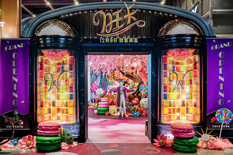 《旺卡》首映禮現(xiàn)場的設(shè)計獨具巧思,直接將電影中的旺卡巧克力店“搬到”影城。觀眾手持旺卡巧克力店“開業(yè)”邀請函,穿過大門,就步入旺卡巧克力店,正式開啟繽紛奇趣的童話世界,令人一秒忘記所有煩惱。