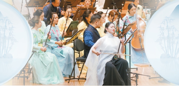 演出由知名華人指揮家湯沐海執(zhí)棒,來自上海民族樂團(tuán)的70余位演奏家一同奏響華章?!昂I仙駱贰狈忠魳窌婧蜕虾R魳窂d駐場版,前者偏向西方當(dāng)代交響音樂會的制式,后者則融入多媒體光影,更傾向于沉浸式音樂現(xiàn)場。因而,曲目會根據(jù)現(xiàn)場環(huán)境和觀眾特征做適當(dāng)調(diào)整。國外演出時(shí),會增加二胡與樂隊(duì)合奏的《臥虎藏龍》(見上圖)——這是東西方觀眾都熟悉,甚至?xí)谘矍案‖F(xiàn)出竹林搖曳畫面的曲目。音樂會版在編曲上的處理會在尾聲處以漸強(qiáng)手法處理中西樂器的合奏共鳴,把情感推向高潮。琵琶、京胡與樂隊(duì)合奏的《楚漢》中,俞冰的琵琶獨(dú)奏氣勢不凡,凸顯出西楚霸王的威武。嗩吶與樂隊(duì)合奏《鳳舞》時(shí),胡晨韻不僅能吹出一個(gè)超乎常人想象的長音,還能與笛子手等一起營造一群鳥兒的生動(dòng)“對話”,時(shí)而平和時(shí)而激動(dòng),惹得觀眾忍俊不禁。而改編自膾炙人口的《野蜂飛舞》的民樂重奏《蜂飛》則賦予俄羅斯作曲家里姆斯基-科薩科夫的經(jīng)典名曲“中華風(fēng)韻”——眼見著民族樂器在王音睿、趙臻、丁龍等掌控的打擊樂、笙和二胡的樂音中展現(xiàn)出妙趣橫生的“畫面”。而開場,金鍇與趙韻夢領(lǐng)銜的竹笛與樂隊(duì)合奏《湖光》則凸顯出江南文化的音樂聲色。