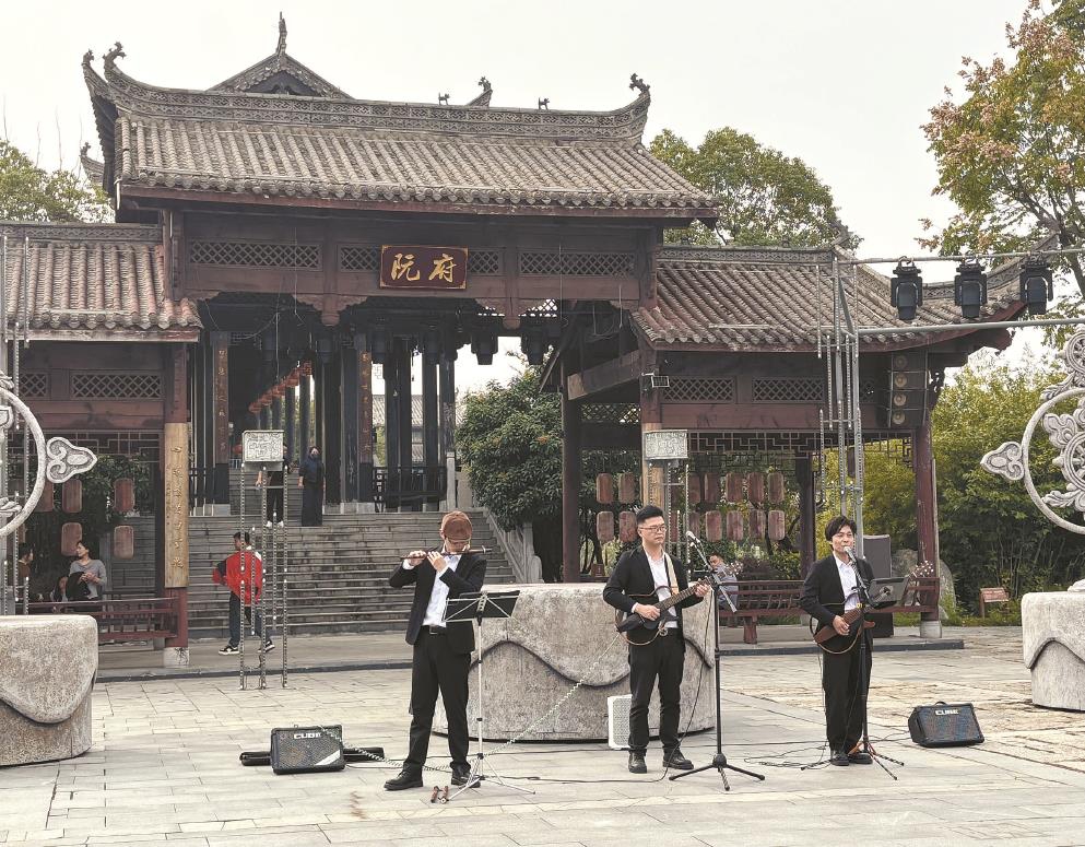 演藝新空間向外擴(kuò)展,蕪湖鳩茲小鎮(zhèn)內(nèi),上海街藝音樂組合正在演出。文匯報(bào)記者 孫彥揚(yáng)攝