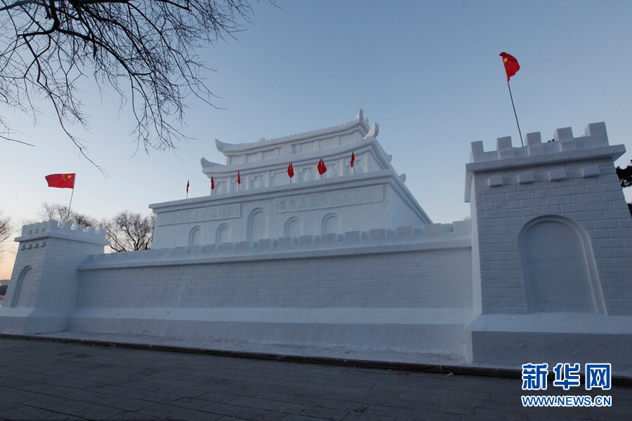 長春南湖公園打造雪雕版“天安門城樓”
