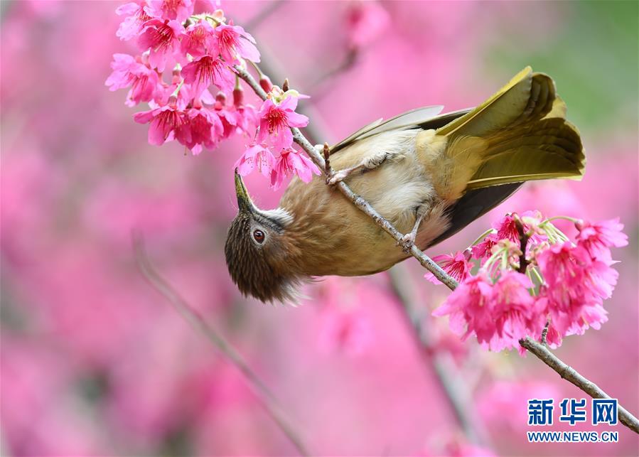 2月18日,一只綠翅短腳鵯鳥在福州森林公園櫻花園采食花蜜。隨著天氣轉(zhuǎn)暖,福州國(guó)家森林公園的2.5公頃櫻花園內(nèi)櫻花盛開,引得眾多鳥兒前來(lái)采食花蜜,春色盎然。 新華社記者 姜克紅 攝