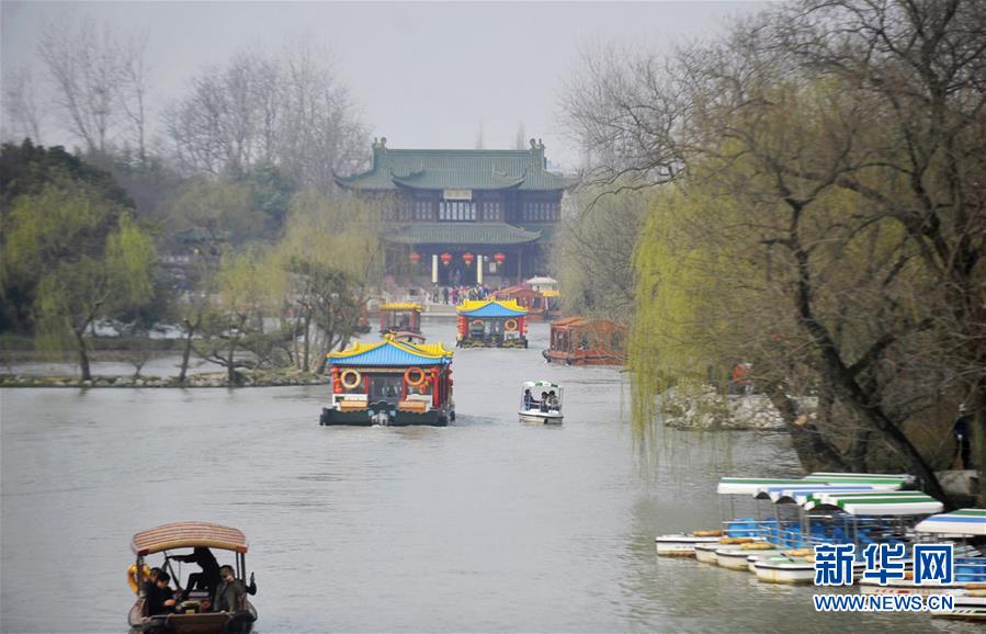 3月6日,游客在揚州瘦西湖賞花。隨著氣溫升高,江蘇揚州市瘦西湖景區(qū)楊柳吐綠,繁花似錦,吸引許多中外游客前來踏春賞花。 新華社發(fā)(孟德龍 攝)