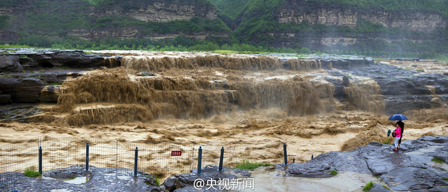 受上游強(qiáng)降雨和水庫(kù)放水影響,最近幾天,黃河壺口瀑布迎來伏汛,最大水流量達(dá)到每秒2600立方米左右,濁流滾滾奔騰而下,氣勢(shì)磅礴!(央視記者李志 文豪)