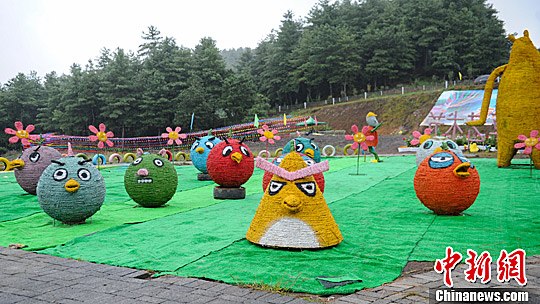 8月31日,赫章縣夜郎國家森林公園展出的稻草卡通形象。中新社記者 賀俊怡 攝
