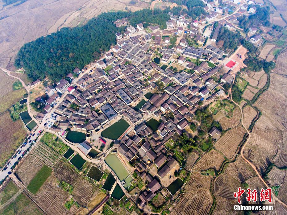 12月10日,航拍位于江西金溪縣有著600多年歷史的中國(guó)歷史文化名村、中國(guó)傳統(tǒng)村落竹橋古村,俯瞰全村,形似一柄巨扇。該村現(xiàn)保存有明代所建民居8幢,明代祠堂1幢,其余為清代建筑,青磚灰瓦,樸實(shí)素雅,為贛派建筑最典型的代表。村前溪水長(zhǎng)流,良田萬(wàn)頃,村后茂林修竹,鳥(niǎo)鳴樹(shù)幽,身歷其境,如入畫(huà)中。傅建斌 攝