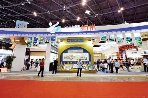 忻州展廳以“欣欣向榮·心靈之舟”為主題布展,展位在設計上將“五臺山”藍天白云與佛教建筑形成的獨特景色融為一體,從立體空間結構、色彩氛圍渲染和建筑元素搭配等幾個方面著手,設計出獨具忻州特色的“佛教圣境”展廳。(本報記者 馮曉磊 攝影報道)