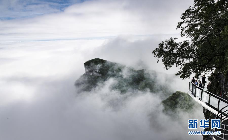 6月10日,游人在漢中市南鄭區(qū)龍頭山景區(qū)玻璃棧道上觀賞云海。 新華社記者 陶明 攝