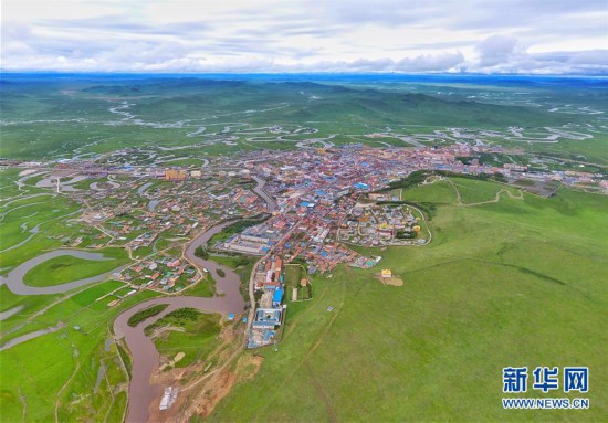 四川省阿壩藏族羌族自治州若爾蓋縣縣城、熱曲河(近)和黑河(遠(yuǎn))(6月17日攝,無人機照片)。 新華社記者 劉坤 攝
