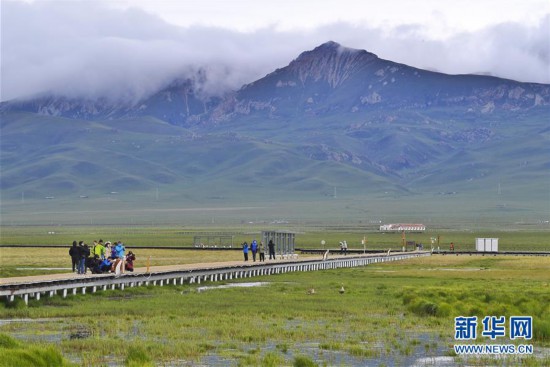 在位于四川省阿壩藏族羌族自治州若爾蓋縣西北部的花湖生態(tài)旅游區(qū),游人走在棧橋上欣賞美景(6月16日攝)。 新華社記者 沈伯韓 攝