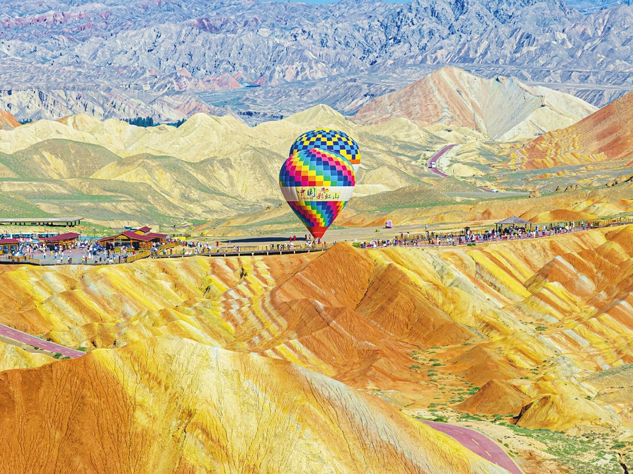 這是8月7日在張掖七彩丹霞景區(qū)拍攝的丹霞景觀(無人機照片)。位于甘肅省張掖市境內(nèi)的張掖七彩丹霞景區(qū)屬張掖國家地質公園,是罕見的丹霞地貌與彩色丘陵景觀復合區(qū)。進入8月以來,七彩丹霞景區(qū)日均游客數(shù)量突破3.5萬人次。