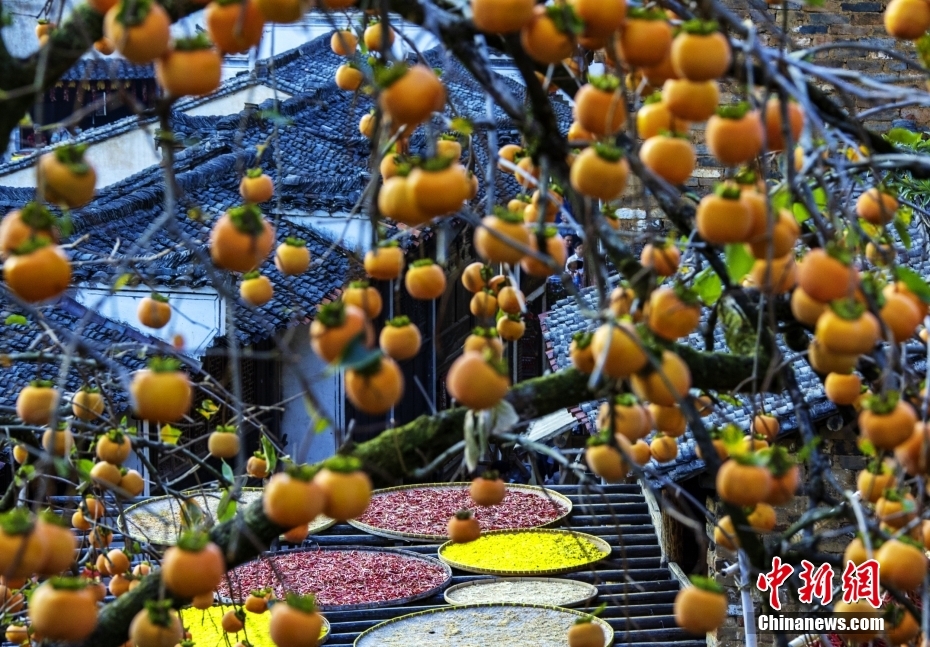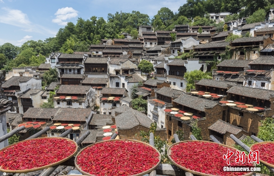 由于婺源的大多村莊是依山而建,平地較少,為將晾曬的食材安排的合理妥當,家家戶戶都展現了自家“空間管理”的高超技巧。圖為江西上饒婺源篁嶺古村,篁嶺獨具古韻的閣樓人家,處處可見絢爛的曬秋。稻谷、玉米、南瓜、豌豆、蘿卜曬在竹匾上,用橫木托著。