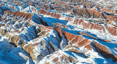 2023年12月15日,甘肅省張掖市在一場降雪之后,潔白的雪花將七彩丹霞裝扮得美輪美奐,白雪宛如輕紗浸在丹霞山上,顯得格外艷麗多彩、如夢如幻。雪后放晴,鏡頭下的甘肅張掖七彩丹霞景區(qū)被雪色覆蓋,顯現(xiàn)出“雪浴丹霞”景觀。殷旭攝(人民圖片網)
