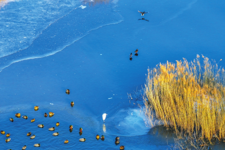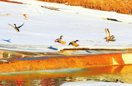 成群的綠頭鴨在方山縣北川河畔時(shí)而展翅飛翔,時(shí)而覓食戲水,為冬日增添了幾許靈動(dòng)。