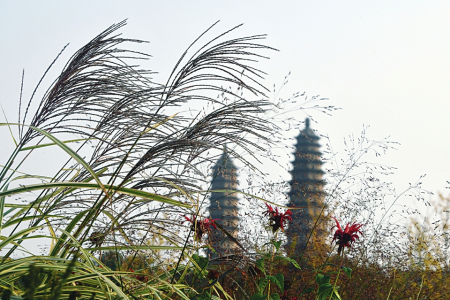4.雙塔掩映在花境微景觀中。