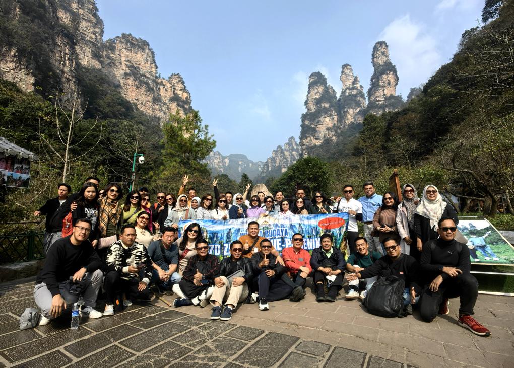 11月5日,來自印度尼西亞的團(tuán)隊游客在張家界國家森林公園留影。(吳勇兵 攝)