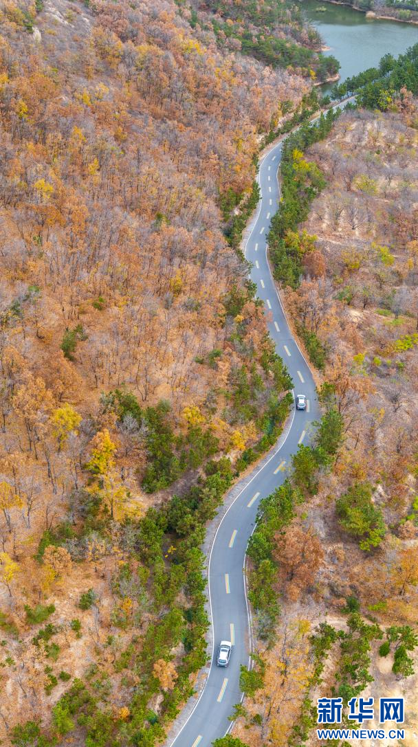 車輛行駛在九仙山景區(qū)的山路上(無人機照片)。新華網(wǎng)發(fā)(單英 攝)