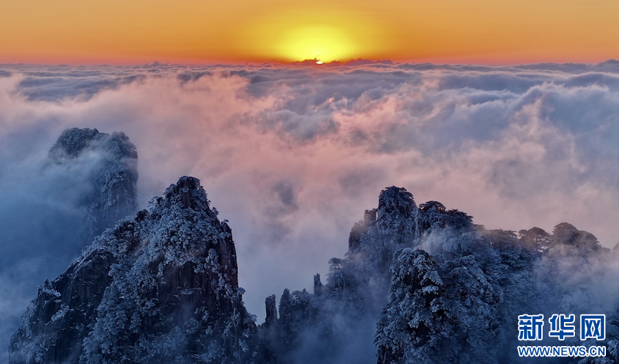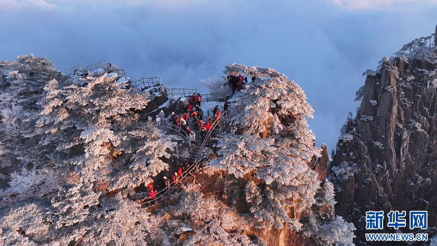近日,安徽黃山雪后初霽,山峰銀裝素裹,滿目玉樹(shù)瓊枝。云霧如同舞者般在白雪皚皚的峰巒間穿梭嬉戲,宛如一幅渾然天成的水墨丹青。