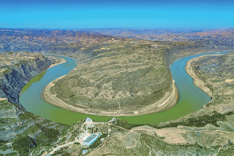 3月20日,俯瞰位于永和縣的乾坤灣景區(qū),蜿蜒的黃河、碧綠的河岸組成了一幅壯美的山水圖景,美不勝收。