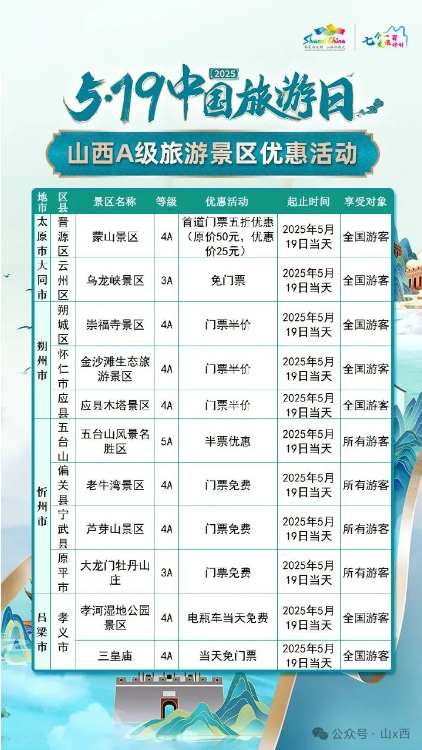 5·19中國旅游日 | 山西A級旅游景區(qū)面向全國游客優(yōu)惠
