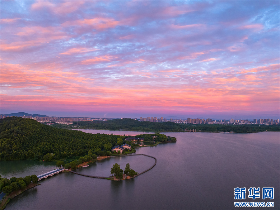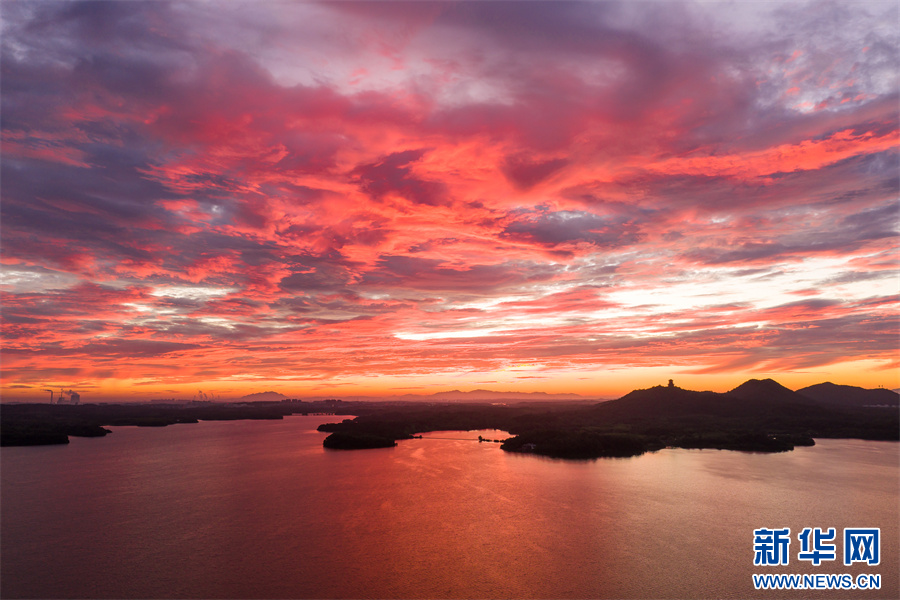 近日,安徽省池州市平天湖上空出現(xiàn)絕美朝霞景觀。新華網(wǎng)發(fā)(李春 攝)