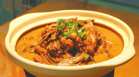 制作過程處處是講究,先泡發(fā)臺(tái)蘑、處理雞塊,用十幾種調(diào)料煸炒雞塊,再與泡發(fā)好的臺(tái)蘑小火慢燉40分鐘,讓山珍的鮮味與雞肉的醇香充分融合,最后大火收汁。這道菜將臺(tái)蘑鮮香與雞肉醇厚完美平衡,湯汁濃郁不膩。