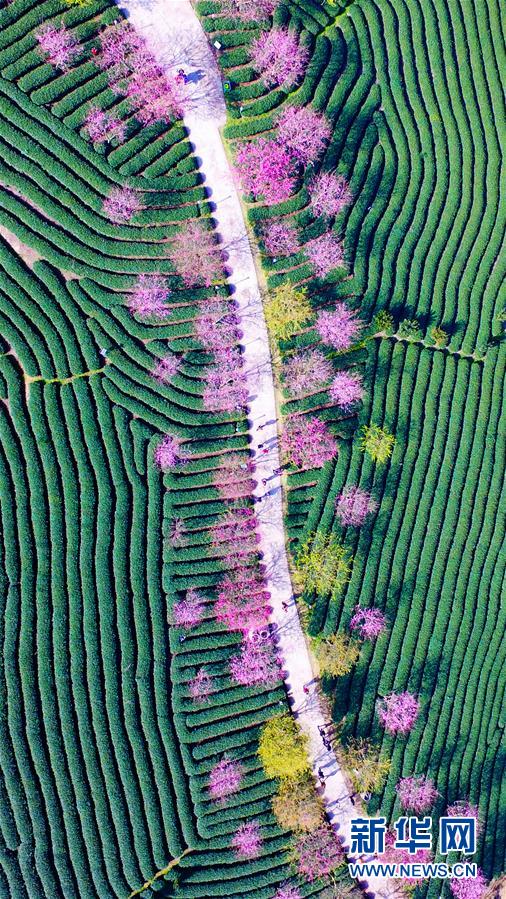 這是2月27日在福建省龍巖市永福鎮(zhèn)航拍的茶園和綻放的櫻花。 近日氣溫轉暖,位于福建省龍巖市永福鎮(zhèn)的15萬株櫻花競相綻放。新華社發(fā)(李藝爽 攝)