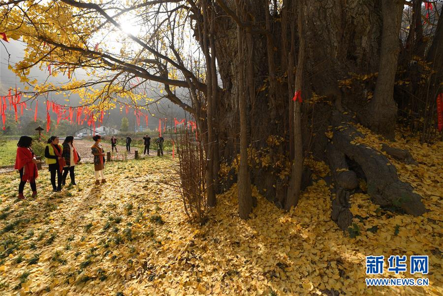 11月19日,游客在留壩縣玉皇廟鎮(zhèn)參觀千年銀杏樹。初冬時節(jié),在秦嶺深處的陜西省留壩縣玉皇廟鎮(zhèn)石窯壩村,一棵千年古銀杏樹的落葉宛如金色地毯,甚為壯觀。據(jù)當(dāng)?shù)亓謽I(yè)部門介紹,該樹胸徑為4.45米,現(xiàn)有高度29米。新華社記者 陶明 攝
