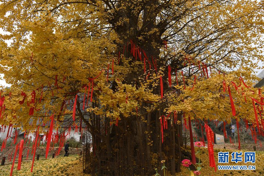 11月19日,游客在留壩縣玉皇廟鎮(zhèn)參觀千年銀杏樹。初冬時節(jié),在秦嶺深處的陜西省留壩縣玉皇廟鎮(zhèn)石窯壩村,一棵千年古銀杏樹的落葉宛如金色地毯,甚為壯觀。據(jù)當(dāng)?shù)亓謽I(yè)部門介紹,該樹胸徑為4.45米,現(xiàn)有高度29米。新華社記者 陶明 攝
