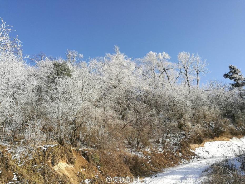 受較強(qiáng)冷空氣影響,秦嶺腹地涼風(fēng)埡山頂,出現(xiàn)大面積霧凇景觀。玉樹(shù)瓊枝,晶瑩剔透,讓涼風(fēng)埡山頂變得像童話世界一般,美不勝收。 央視記者王志杰 圖片來(lái)源:央視新聞微博