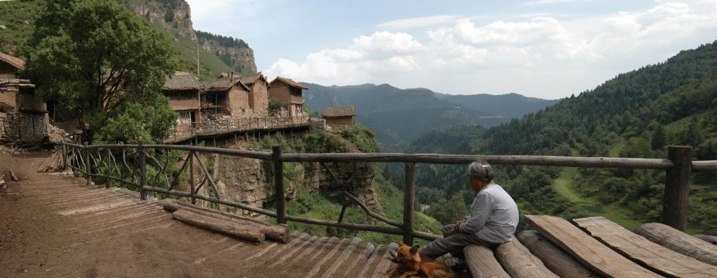 隱沒在深山老林中的王化溝分布在大約一華里長(zhǎng)的絕壁上,背依懸崖,面臨百丈深淵。全村20余戶,60多口人。村西的懸崖上聳立著一塊巨石,村里人稱之為“石人”,村后的山也因此稱作“石人山”。村中的房子大都臨崖而建,以木柱支撐,高低錯(cuò)落,避風(fēng)向陽。這些房子建在懸崖上看似危險(xiǎn),實(shí)則非常堅(jiān)固,至今還有清代的房子保存完好。由于地盤不足,所以沒了庭院,只有一條走廊。就是街道也只能用木料搭建,懸于空中。當(dāng)然作為農(nóng)家,牲畜的圈舍是免不了的,這里也需要精心擺布,精心建造,絕不至于讓牲畜落下深淵。