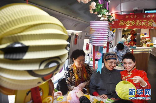 當(dāng)日,中國(guó)鐵路濟(jì)南局集團(tuán)有限公司在部分列車上開(kāi)展“品味多彩元宵共享幸福旅程”活動(dòng),舉行猜燈謎、品元宵、展茶藝、做花燈等活動(dòng),邀請(qǐng)旅客共同參與。 新華社記者 李紫恒攝