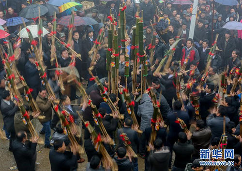 1月14日,人們在廣西融水苗族自治縣紅水鄉(xiāng)舉行的蘆笙節(jié)上賽蘆笙。新華社記者 陳君清 攝