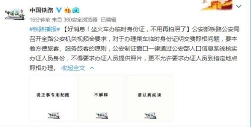 4月19日,《新華每日電訊》刊登《辦臨時身份證坐火車,非得拍照證明自己是自己?》引起社會廣泛關(guān)注。公安部鐵路公安局有關(guān)負(fù)責(zé)人回應(yīng)稱,已要求所有辦證單位和人員不得再要求辦證人員提供照片。