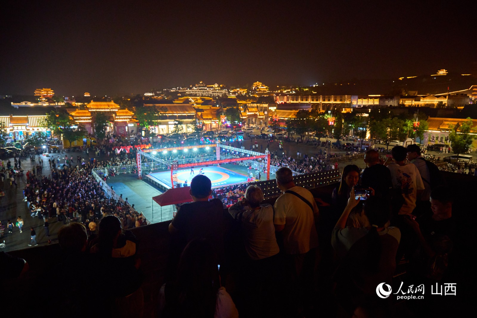 游客們在忻州古城城墻上觀看對抗撓羊賽。人民網(wǎng) 張超寧攝