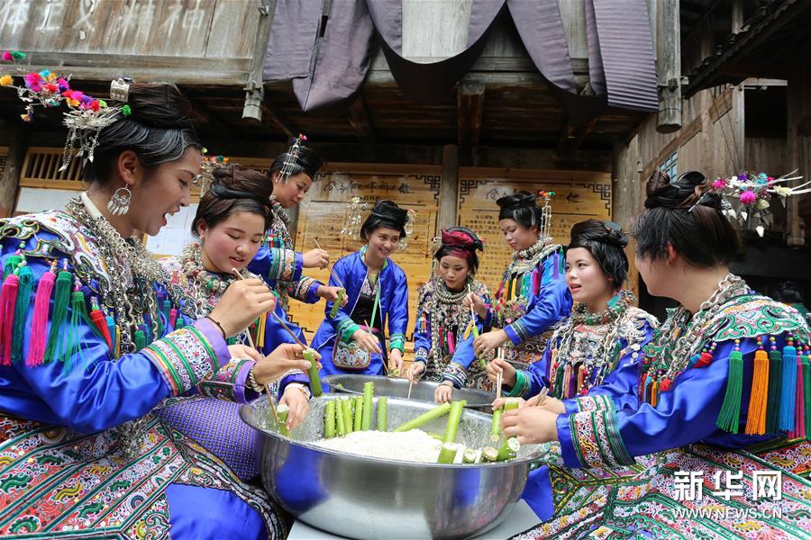 5月3日,貴州省首批魅力侗寨——榕江縣烏公侗寨歡度傳統(tǒng)的竹米節(jié),重溫侗民遠(yuǎn)古農(nóng)耕風(fēng)情。竹米節(jié)也叫吃竹筍飯,在每年谷雨至立夏期間竹筍生長的時候,侗族群眾采摘斑竹筍,把糯米灌進(jìn)筍筒煮熟食用。這樣既能保持米飯的原味,又有竹筍的清香,并且還方便攜帶至坡上田間地頭食用。久而久之,侗族人每到春夏之交的農(nóng)耕時節(jié)都會過竹米節(jié),殺豬宰羊祭祀侗族祖先,唱歌跳舞祈求五谷豐登。新華社發(fā)(楊成利 攝)