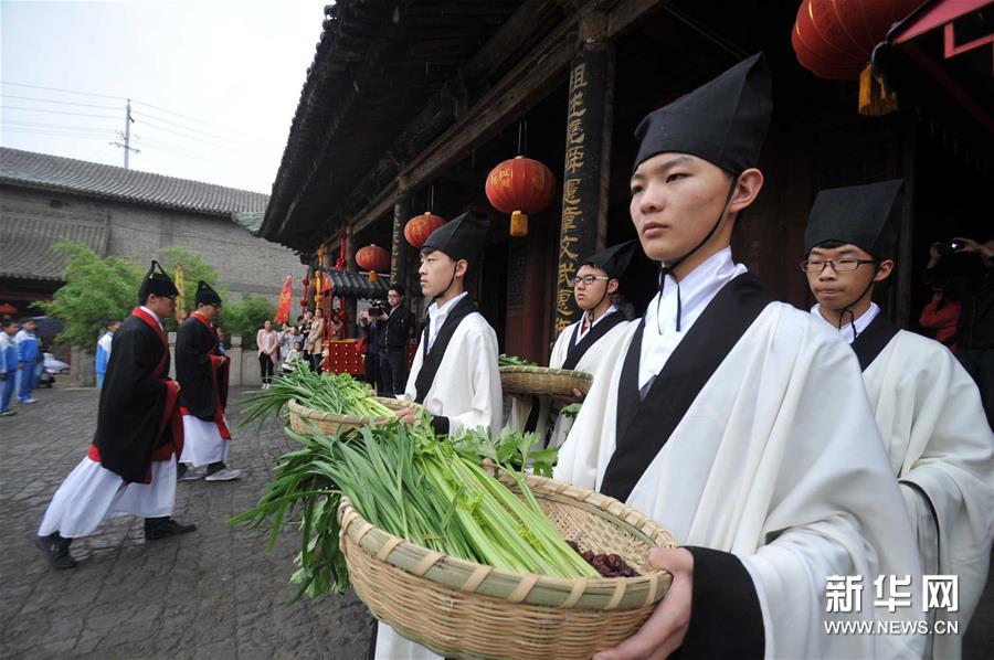 5月7日,山西運(yùn)城新絳縣在當(dāng)?shù)厍旯懦墙{州的文廟首次舉行釋菜禮大典,以弘揚(yáng)傳承尊師古文明,吸引了城鄉(xiāng)眾多群眾和中小學(xué)生冒雨觀典。新華社發(fā)(高新生 攝)