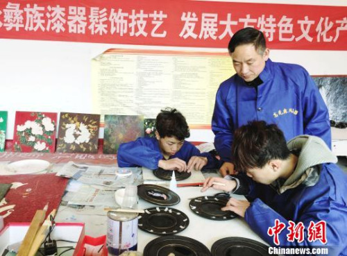 “大方彝族漆器髹飾技藝”貴州省級非遺代表性傳承人高光友指導學徒制作漆器。