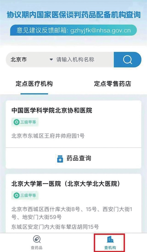 第三步:點擊“定點醫(yī)療機構(gòu)”或“定點零售藥店”,即可查詢該藥品在各地區(qū)的配備情況。同時,您也可以點擊頁面下方“查機構(gòu)”,進入“定點醫(yī)療機構(gòu)”或“定點零售藥店”頁面,確定具體的醫(yī)療機構(gòu)或零售藥店后,點擊“藥品查詢”,了解該機構(gòu)配備的全部“國談藥”情況。