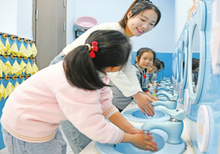 4月7日,浙江省臺(tái)州市仙居縣中心幼兒園小朋友在學(xué)習(xí)正確的洗手方法。世界衛(wèi)生日當(dāng)日,各地舉行形式多樣的主題活動(dòng),倡導(dǎo)良好的衛(wèi)生習(xí)慣和健康的生活方式。