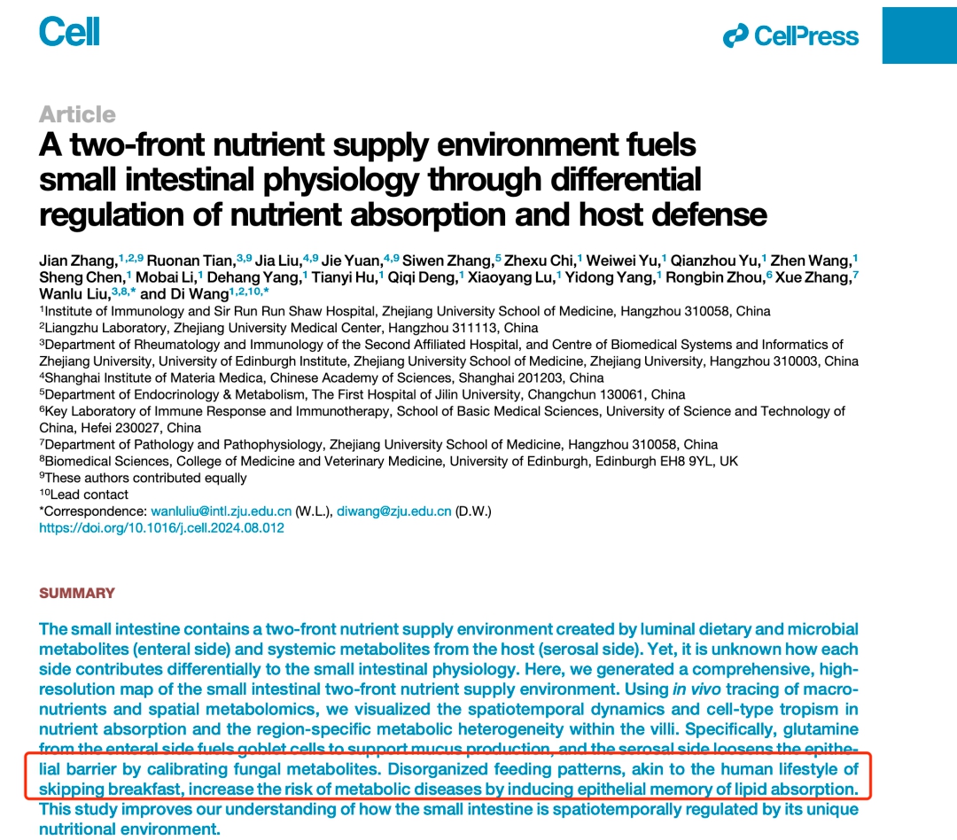 日前,浙江大學(xué)醫(yī)學(xué)院附屬邵逸夫醫(yī)院、浙江大學(xué)愛丁堡大學(xué)聯(lián)合學(xué)院、中國科學(xué)院上海藥物研究所的研究團(tuán)隊,在頂尖學(xué)術(shù)期刊《細(xì)胞》(Cell)上合作發(fā)表一篇論文表明,不吃早餐的這種飲食習(xí)慣會改變小腸對營養(yǎng)物質(zhì)的吸收方式,從而會增加代謝性疾病的風(fēng)險。